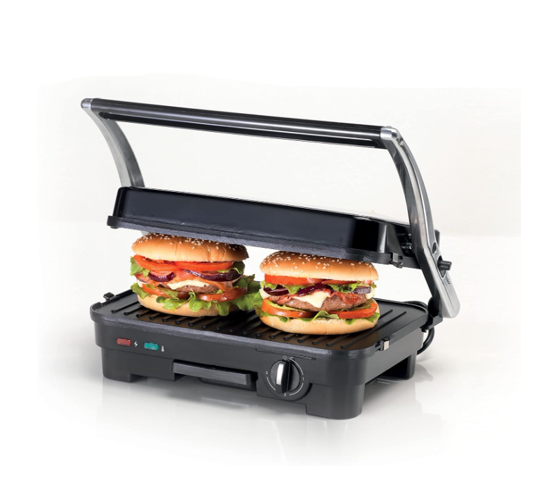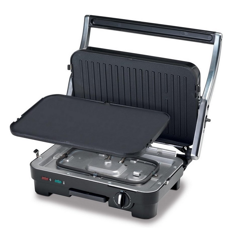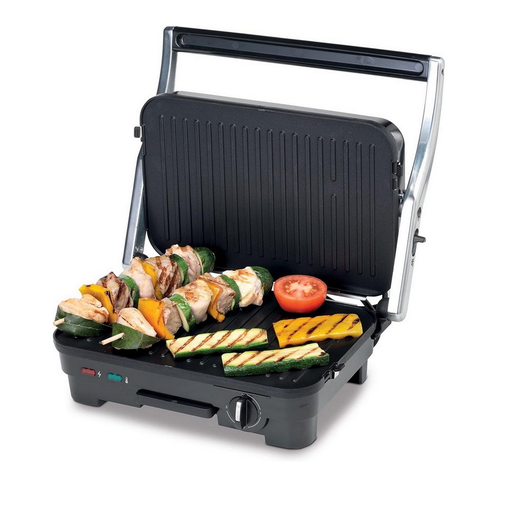 سخان وشواية عملية من كينوود HGM 50.000 SI مصنوعة من الستانلس ستيل ومزودة بميزات أمان مثل المفتاح بضوء إشارة وقفل حماية. تتميز بصفائح قابلة للفك للتنظيف السهل، ويمكن فتحها 180 درجة للاستخدام كشواية مسطحة. باستطاعة 1800 واط، تعد خياراً رائعاً لتحضير وجبات شهية ومتنوعة.