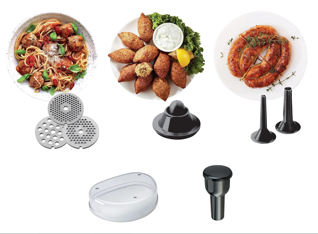 The Kenwood MG510 Meat Grinder is designed to deliver powerful performance and high speed in preparing fresh meats. Its durable metal body ensures longevity, while it provides three blades of different sizes for fine or coarse grinding. It can also be used to easily prepare kibbeh and sausage.