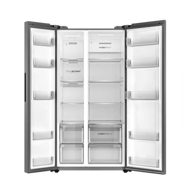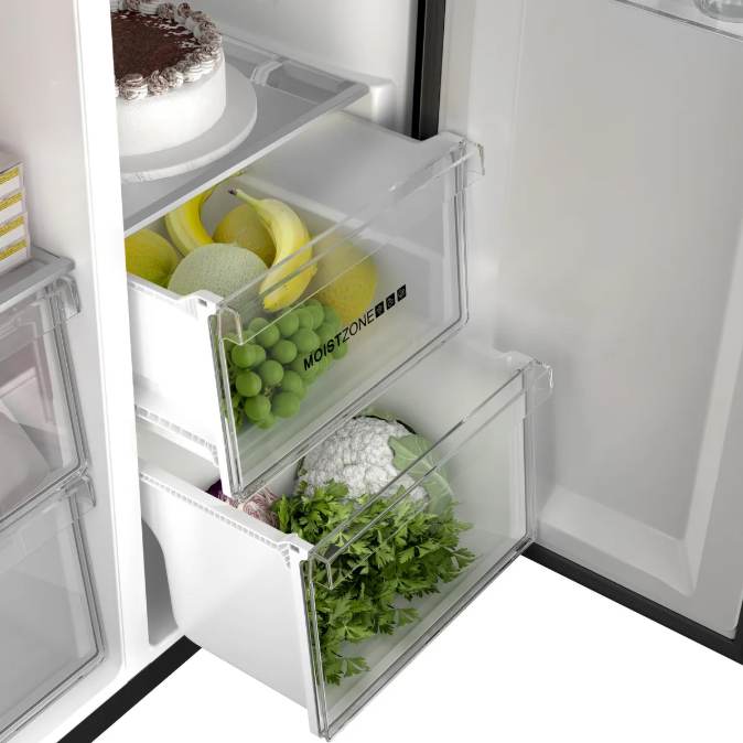 The Haier HRF-768DP double-door refrigerator features a cabinet design and an elegant silver finish. It is air-cooled and features a Twin Inverter compressor for energy efficiency. Using R600A gas, it delivers powerful cooling performance down to -22°C. It features interior LED lighting, a digital temperature control display, and a rapid cooling feature. It also includes a dedicated energy management system for extended periods of absence. The air distribution system ensures even cooling across all shelves. To preserve fresh produce, it comes with a humidity management system inside the drawers, keeping fruits and vegetables at an ideal humidity level of up to 90%.
